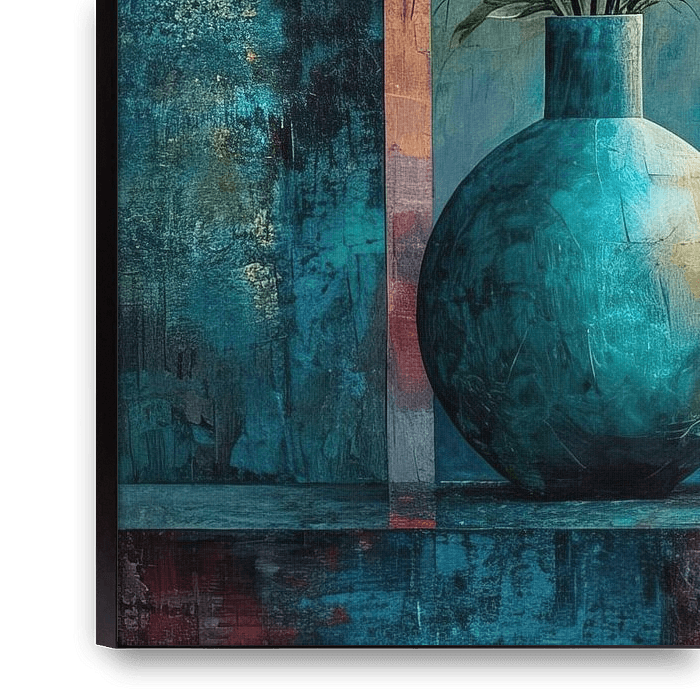 Details: still life, flowers, vase, sun, modern, red, blue, orange, abstract, canvas