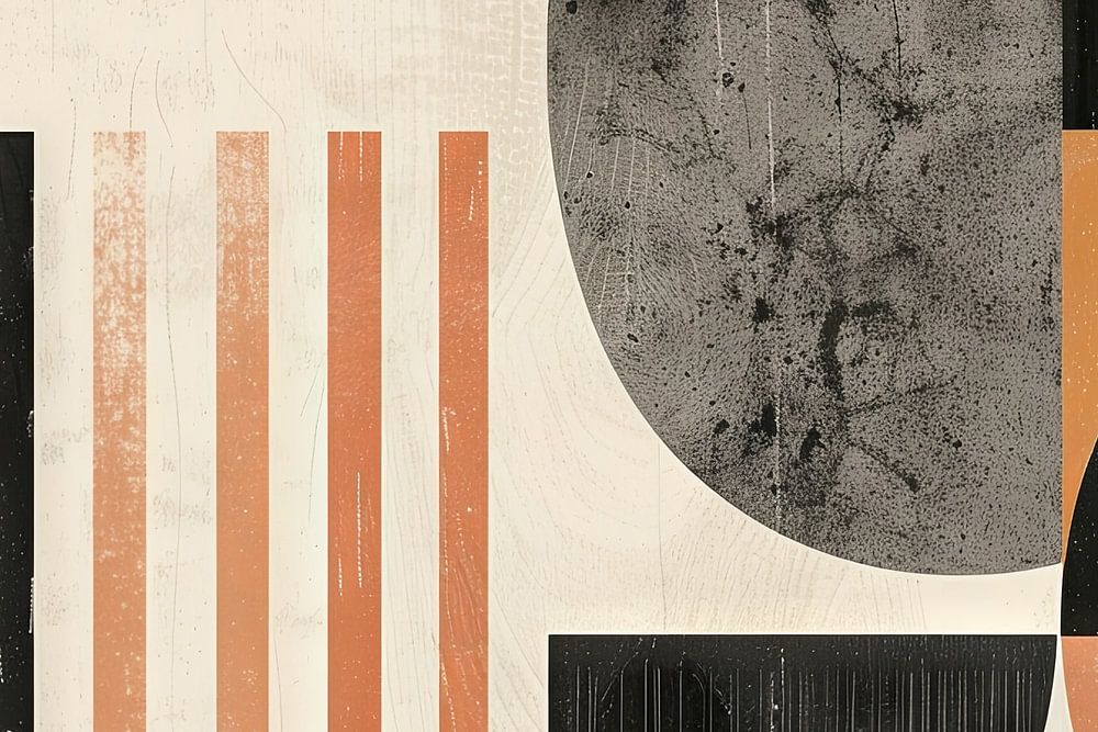 The picture shows an abstract composition of geometric shapes in different colours. Circles, semi-circles and vertical stripes in black, orange and beige are arranged on a light-coloured background. The different textures of the shapes lend the work a special depth and dynamism.