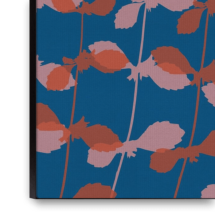 Buy this abstract artwork Modern minimalist botanical art. Leaves in pink and terracotta on blue by Abstract Minimalist Art on canvas, ArtFrame, poster and wallpaper, printed on demand in high quality.