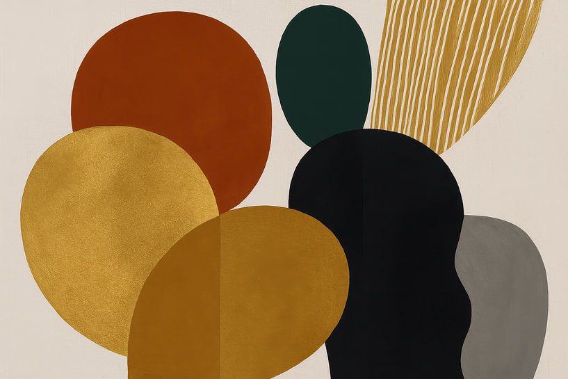 Large oval areas of colour in ochre yellow and rust brown overlay a deep black silhouette shape, while a dark green ellipse brings tranquillity and fine vertical stripes add rhythm. The matt cream background keeps the overall look light and balanced. The contrast between warm accents and cool grey gives the composition depth without…