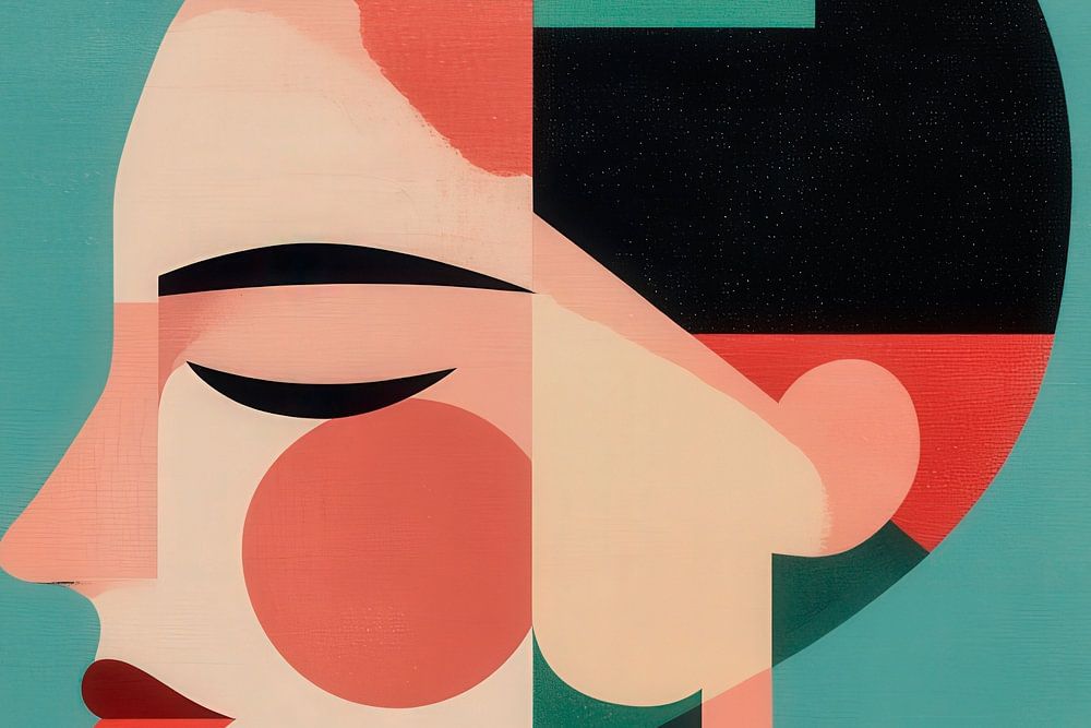 A stylised facial contour is presented in soft shades of colour, playing with geometric shapes and harmonious lines. The combination of bright red, soft pink and bold black gives the picture a modern elegance. Perfect for the living room, it brings a touch of artistic sophistication and is thought-provoking.