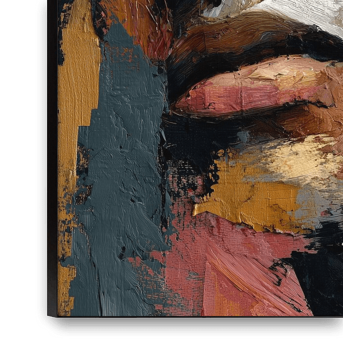 In this penetrating portrait, the face of a dark-skinned woman takes centre stage, portrayed powerfully and inescapably. The close-up creates an immediate connection, with her gaze feeling both confident and vulnerable. Warm tones such as terracotta, copper, gold and deep brown are interspersed with cooler greys and dark blues, giving…