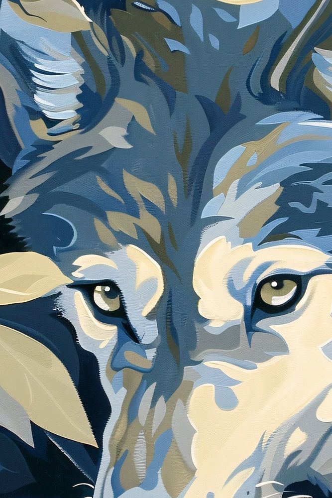 This beautiful artwork shows a detailed portrait of a wolf, hidden among an abundance of leaves in cool colours such as blue and green. The modern style in which the painting is created emphasises the grace and mystique of the animal, with its sharp gaze immediately grabbing attention. The subtle colour combination creates a calm yet impressive look, making this piece perfect for interiors that want to add a modern, natural yet sophisticated touch. Particularly suitable for animal art lovers, the design offers a calm yet powerful visual experience that can enrich any space, from living rooms to offices.