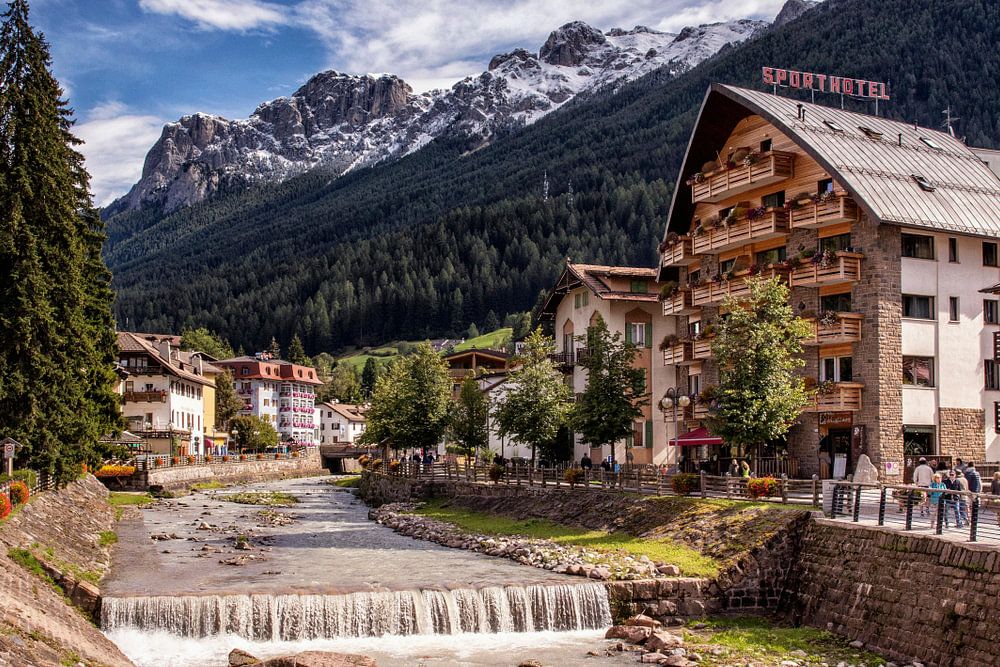 The small river Torrente Avisio which runs through the town of Moena in the Italian Dolomites.