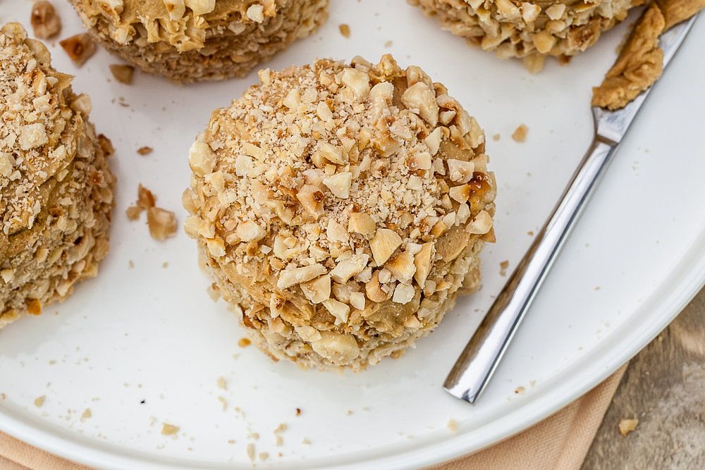 mokka gebakjes met geroosterde hazelnoten op een wit bord en houten ondergrond.