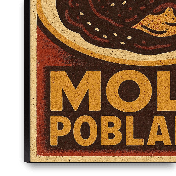 Celebrate the heart of Mexican gastronomy with this bold Mole Poblano poster, a tribute to Puebla’s most iconic dish. The rich tones of deep chocolate brown and ochre reflect the sauce’s earthy complexity—where cacao, chili, and spices blend into culinary magic. A church skyline rises subtly in the background, paying homage to Puebla’s…