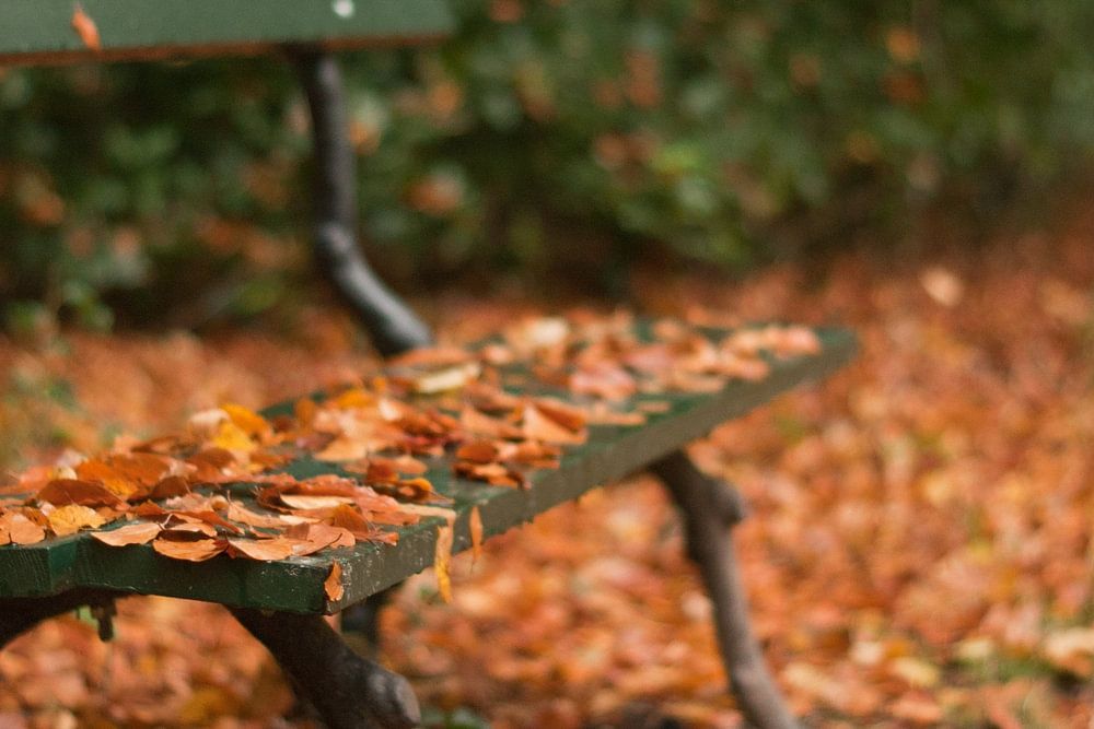 A bench covered in autumn leaves. A serene image in an autumn setting. Just push the leaves aside and you can sit down and enjoy the tranquillity.