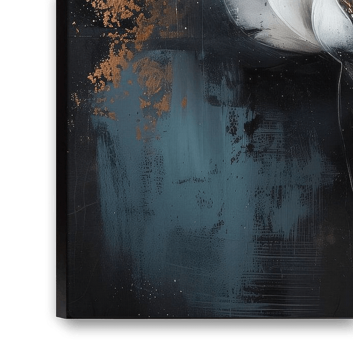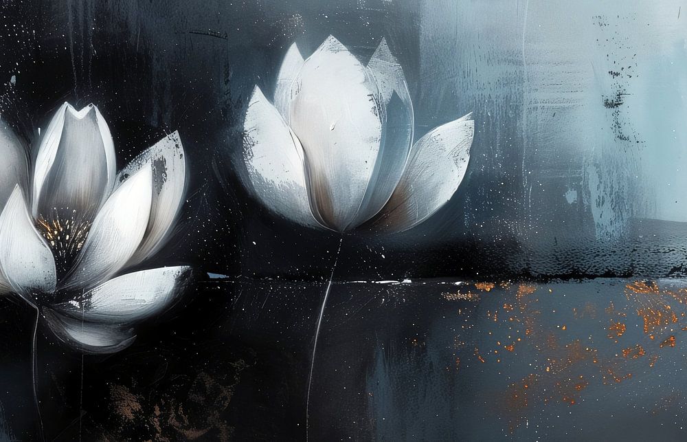 Abstract minimalism featuring two white lotus flowers on a grey-blue background with gold accents and a weathered grunge texture.