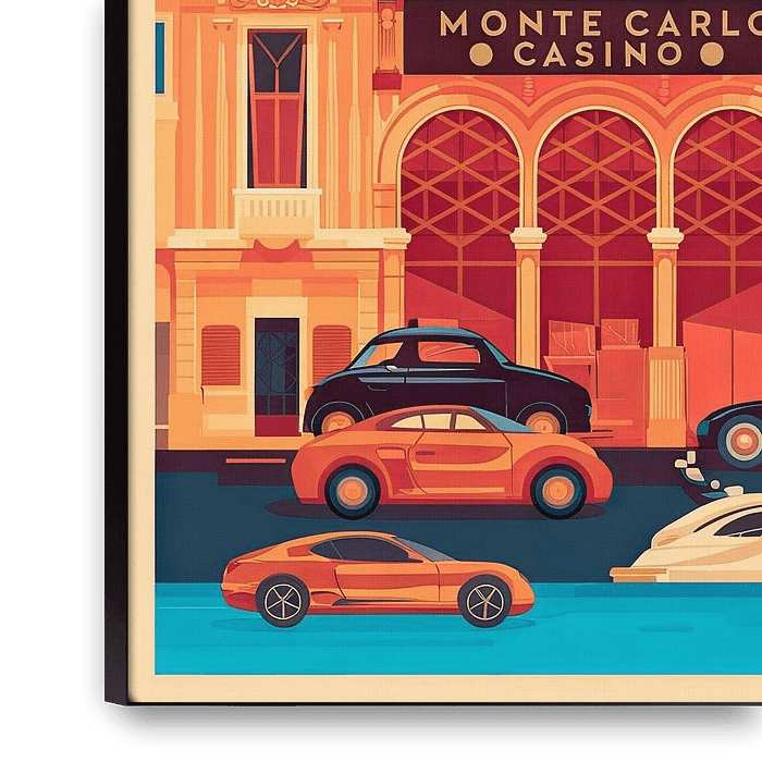 In radiant colours, Monaco blossoms in a blaze of luxury and elegance. The magnificent Monte Carlo Casino, framed by rolling hills and a spectacular sunset, draws the eye with its ornate details. Sports cars and yachts complete the picture of a glittering world full of glamour and exclusivity.