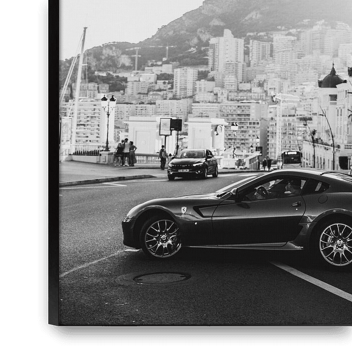 Ferrari in the beautiful streets of famous Monte Carlo in Monaco, in black & white