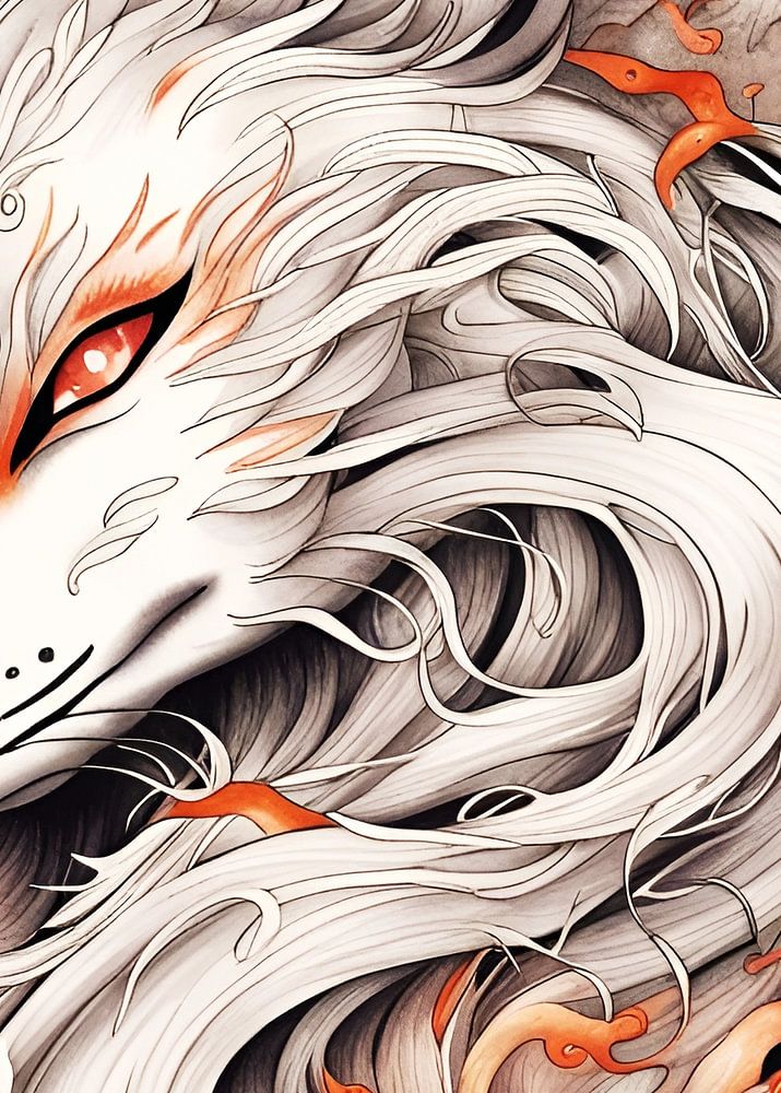 A monochrome portrer of a Japanese Kitsune, trickster foxes from traditional Japanese folklore, with white and orange colours.