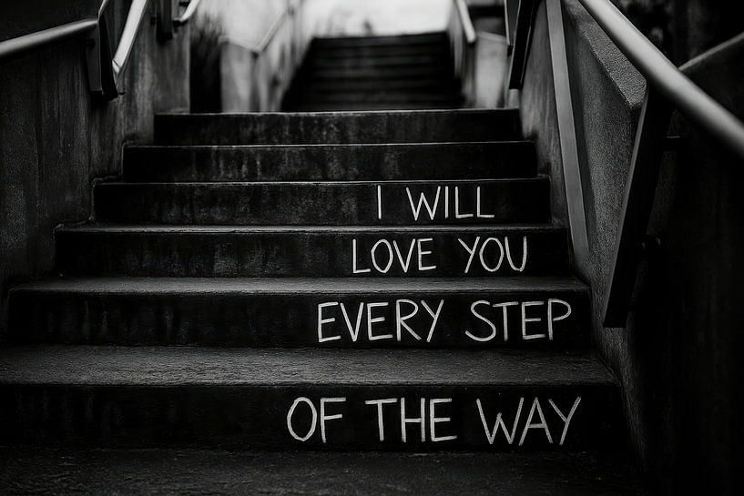 White letters on dark steps form a powerful message of love, neatly placed across the ascending lines. The rough concrete structure, the rhythm of the steps and the strong black-and-white contrast create depth and direction. This photograph exudes urban tranquillity and minimalism, with a focus on typography and form. The interplay of…