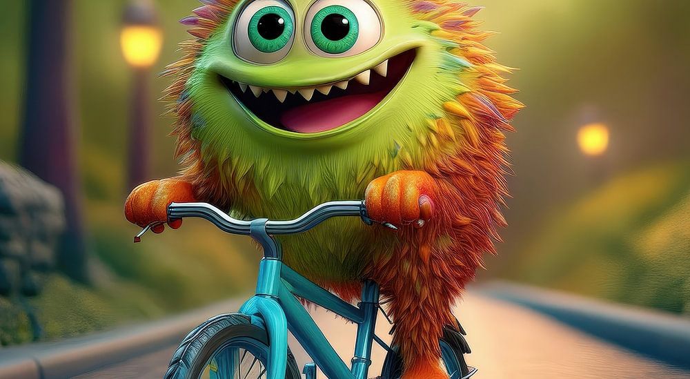 The cute little monster is colourful and has fluffy fur in bright colours. It is sitting on a tiny bicycle, its wheels turning happily. With its big, bright eyes and broad smile, it seems to be full of joy and energy. The surroundings are idyllic.