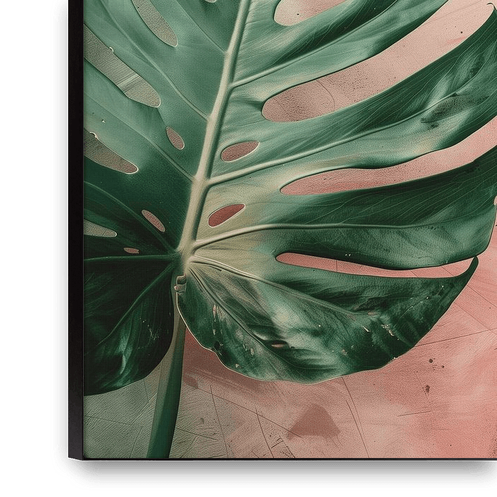 This work shows a single Monstera leaf against a textural background. The leaf's presence is powerful, but not tight or perfectly elaborate. The background shows visible layers and subtle irregularities, giving the work a painterly character.