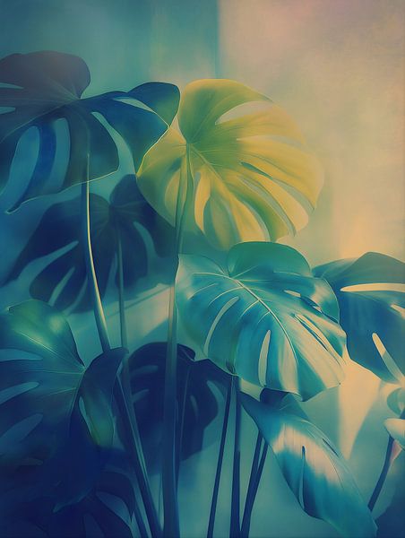 A monster plant bathed in soft, diffused light that envelops the leaves like a layer of yellowed varnish. The characteristic indented leaf shapes are sharp and graphic, whilst the texture of the leaf surface — with visible veins and subtle tonal variations — possesses the richness and depth of a painted surface. The edges of the leaves…