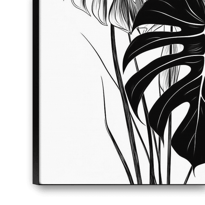 A stylish black-and-white illustration of Monstera leaves in a commissioned dark-romantic illustration. Realistic leaf pattern with lots of depth and texture in a minimalist style. Detailed botanical illustration with subtle use of light and dark contrast.