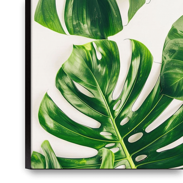 This artwork features an abundance of lush tropical leaves that create a jungle feel. The large monstera leaves are arranged with various palm leaves, creating a dense and vibrant appearance. The deep green tones of the leaves create a calming atmosphere, ideal for rooms that need a touch of nature and freshness. Perfect for lovers of…