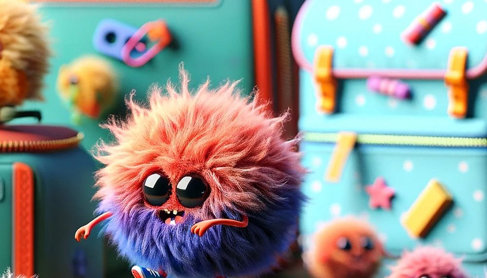 The picture radiates the first day of school with vibrant colours and cheerful chaos. It shows a group of fluffy monsters of different sizes and colours surrounded by school supplies. In the centre is a large, blue monster with wide open eyes, sitting on a miniature chair and holding a pencil. In front of him is another enthusiastic monster reading a book, while smaller, equally charming monsters cavort among pencils and crayons. The scene is dominated by a large, turquoise-coloured school bag with the word "September" written on it. The school bag is covered in colourful, dot-shaped decorations and filled with more pencils, symbolising the start of a new school year. Confetti and streamers can be seen flying in the background, emphasising the festive atmosphere of this special day. Wax crayons, erasers and a pad with the number "2" scattered on the table complete the scene. The composition is an explosion of creativity and promises an exciting and enjoyable learning adventure.