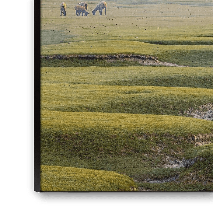 The sky over the bay shows soft transitions: from warm gold close to the horizon to a softer peach and pastel orange in the upper layers. The stillness of the morning becomes palpable-only the gentle movement of sheep through the grass breaks the moment of serene calm.