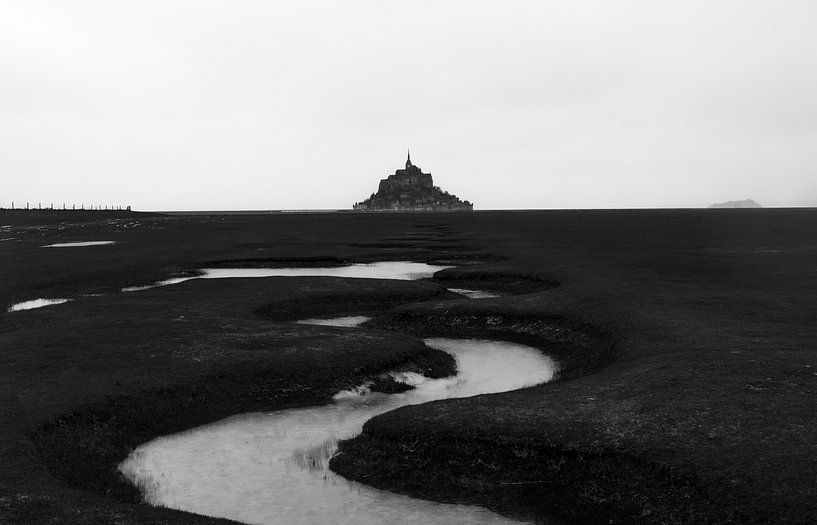 A stunning depiction of Mont Saint Michel in a minimalist fine art style set against the salt marshes