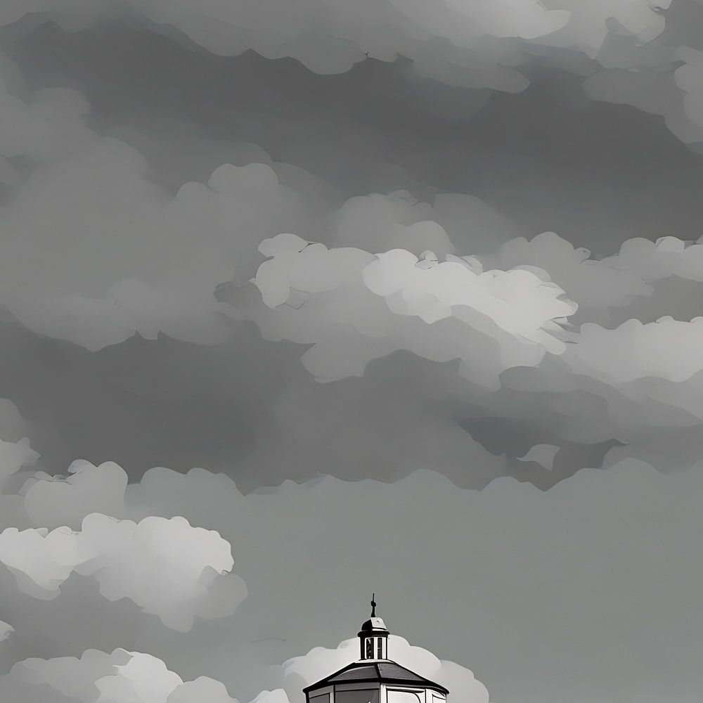 This image depicts a large, historic church situated on a hilltop, Monte dei Cappuccini, with a dramatic and expansive sky filled with thick, billowing clouds. The scene is rendered in grayscale, giving it a timeless and serene quality. The architecture of the monastery is detailed, with a prominent central dome and multiple buildings extending outward. The contrast between the solid, structured buildings and the fluid, dynamic clouds creates a striking visual effect.