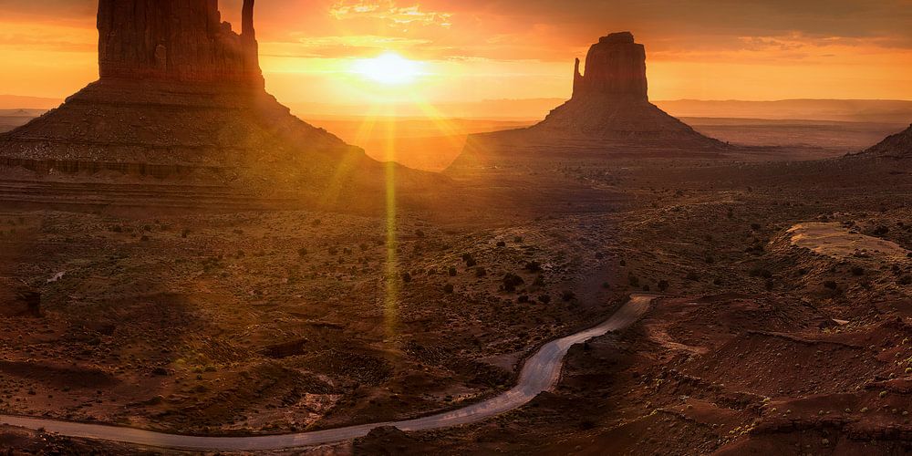 Atmospheric sunrise of the famous mesas of Monument Valley on the plateau of the Colorado Plateau in Utha. Monument Valley is located in the southwest of the USA on the border between Utha and Arizona. It has served as a backdrop for many western movies and is one of the scenic highlights of the region around the Colorado Plateau.