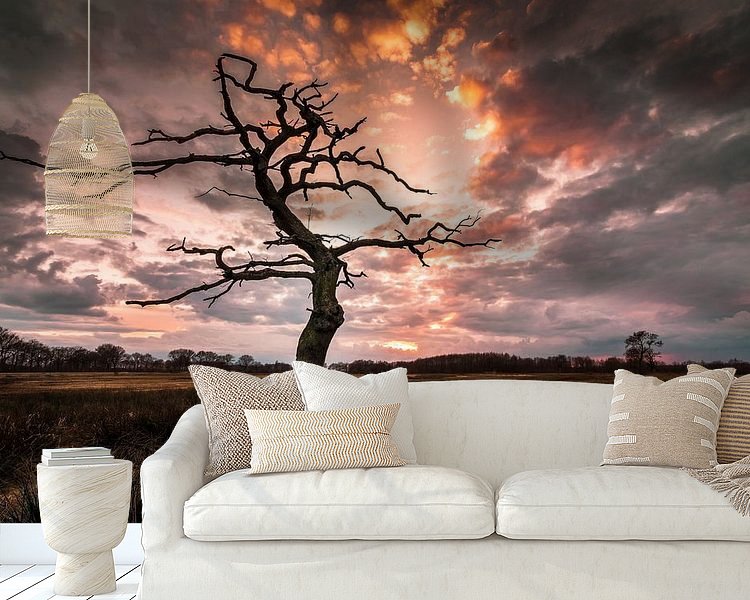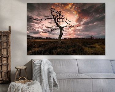Een typisch drents gezicht, oude dode bomen in het landschap. Dit was tijdens zonsondergang.