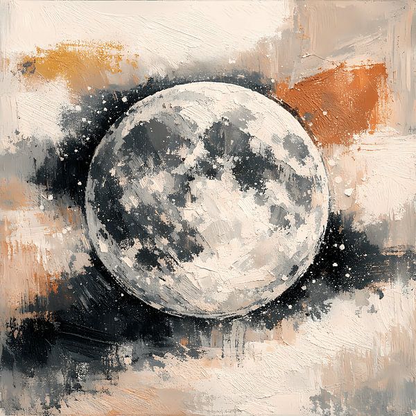 An atmospheric painting of the moon that combines realistic crater details with abstract, cloud-like brushstrokes. The harmonious blend of grey, beige and black tones creates a calm, almost meditative atmosphere, making the piece a modern highlight for living rooms, studios or galleries.