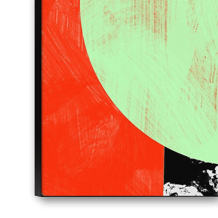 This abstract collage combines bold areas of colour and graphic structures to create a calm but exciting overall picture. The focal point is a large, mint green circle with delicate textures, which is superimposed over four contrasting colour segments: warm red, deep purple, earthy ochre and a dynamic black and white pattern. The combination of geometric clarity and organic texture creates a sense of balance, rhythm and modern elegance. An expressive statement piece for rooms looking for creative energy and colourful accents.
