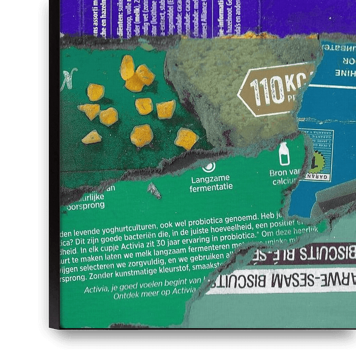 Befitting the current zeitgeist, it involves the reuse of waste material. Commercial advertising has been used here to replace paint and traditional artists' craftsmanship