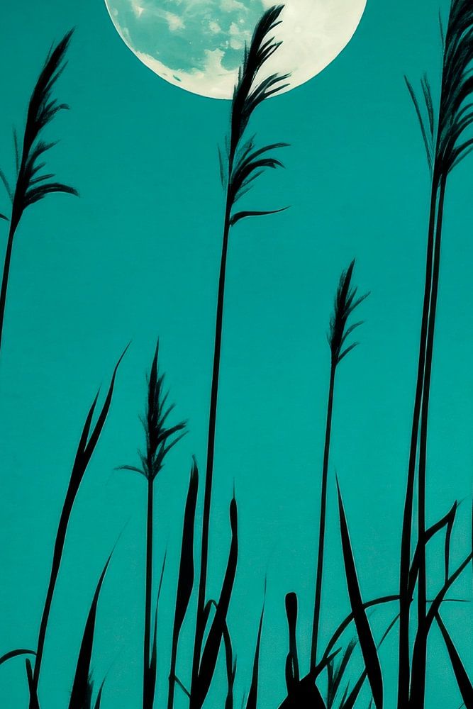 In the soft twilight, the silver disc of the full moon rises majestically in the sky, while delicate blades of grass sway in the gentle wind. Their shadows dance mysteriously on the ground, and the cool, mystical atmosphere unfolds a sensual calm that transports nature into a dreamlike state. A perfect moment between day and night.