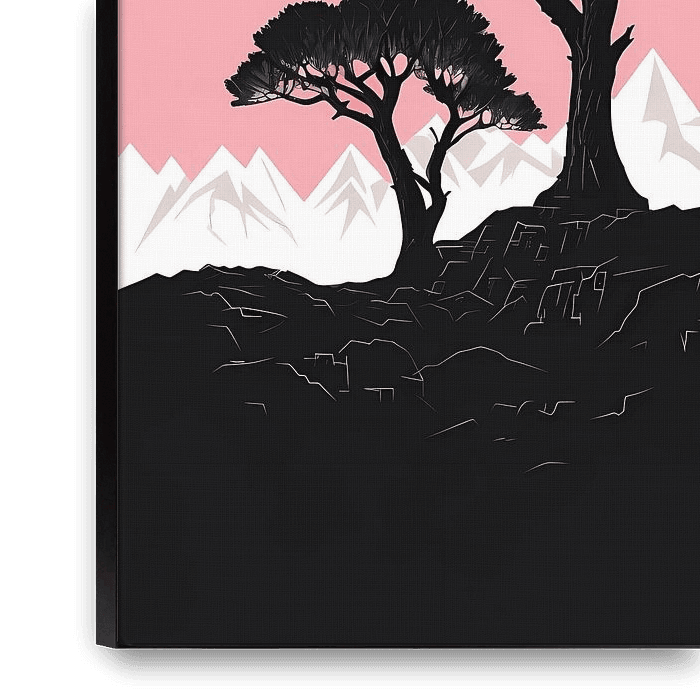 This striking silhouette art piece captures a serene night scene. Two majestic, dark trees stand prominently against a soft pink sky illuminated by a crescent moon. Jagged, snow-capped mountains form a distant, contrasting backdrop, adding depth and a sense of wild beauty to the composition. The dark foreground suggests rocky terrain or…