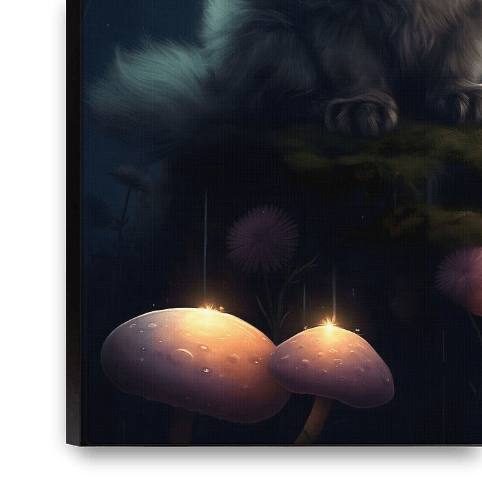 A small, gray kitten gazes out at the world with wide, blue eyes, surrounded by the enchanting glow of bioluminescent mushrooms. This digital painting captures the magic of a moonlit forest, inviting viewers to explore a world of wonder and imagination.