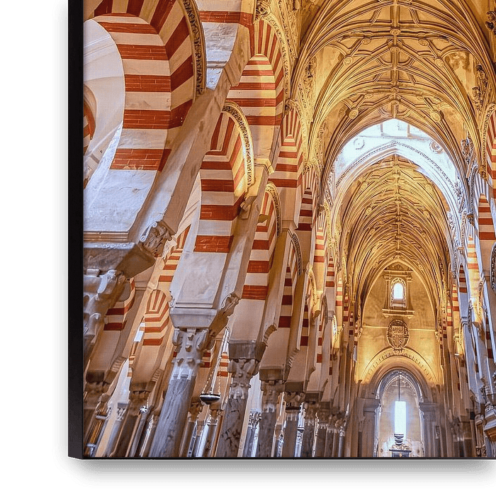 The picture shows the impressive interior of the mosque-cathedral of Córdoba, one of the most important historical buildings in Spain. At the centre are the iconic red and white horseshoe arches that run rhythmically and elegantly through the spatial structure. These characteristic columns and arches are a prime example of Moorish…