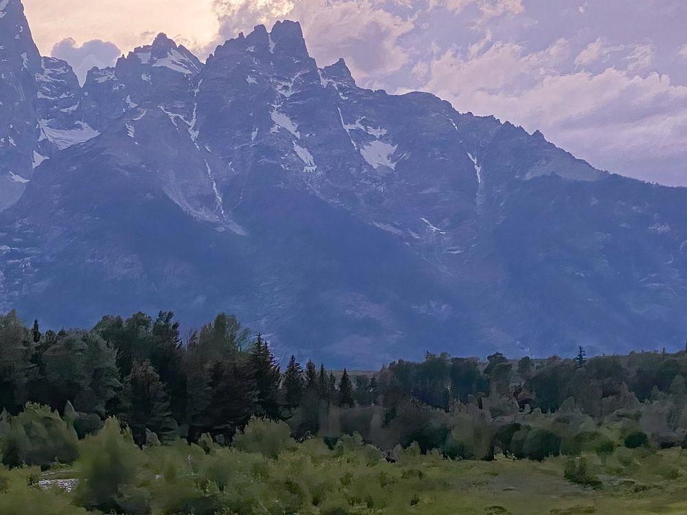 Moose grazing aquatic plants in the Snake River in the Grand Teton, United States of America. Xat was my delight at this apparition. In the background, the majestic snow-capped mountains of the Grand Teton.