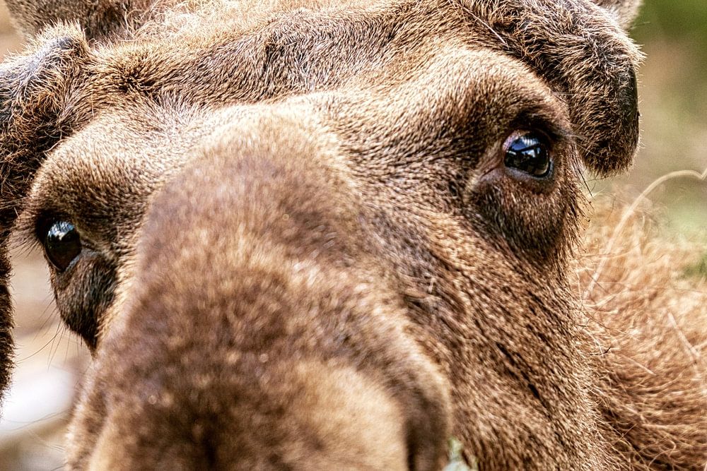Moose on a green meadow in Scandinavia. King of the forests in Sweden. Largest mammal in Europe. Animal photo