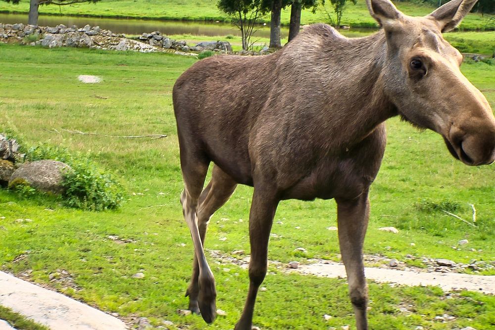 Moose on a green meadow in Scandinavia. King of the forests in Sweden. Largest mammal in Europe. Animal photo
