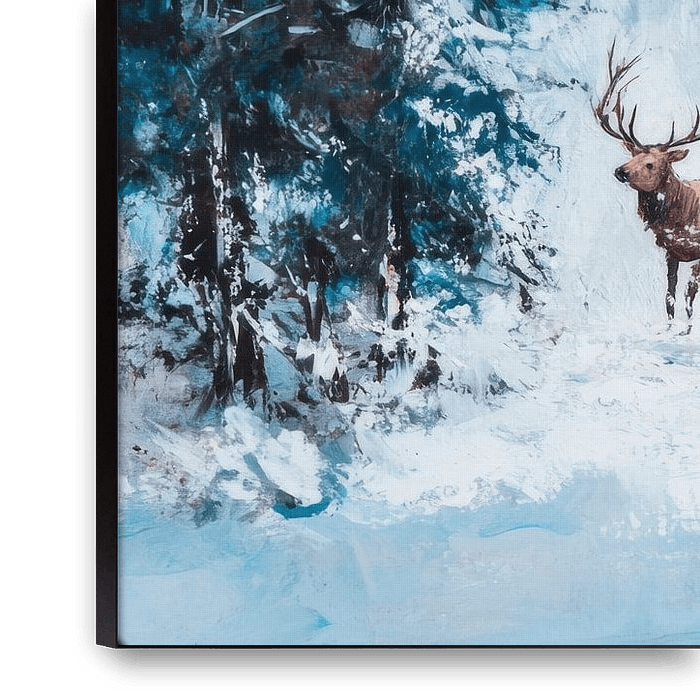 The white fields of snow spread out majestically in a wintry fairytale landscape, framed by snow-covered fir trees. Five proud deer with imposing antlers move sinuously through the tranquil scenery. Their warm, brown colours contrast vividly with the frosty surroundings, while the gentle mist creates a mysterious aura. A harmonious…