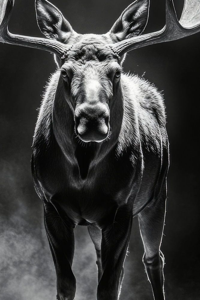 With majestic, sweeping antlers and a penetrating gaze, this animal radiates primal power and grace. The monochrome colour scheme enhances the dramatic effect and draws all eyes to it. Ideal as a statement piece in the living room, it adds an imposing, natural touch to any room and inspires conversation.
