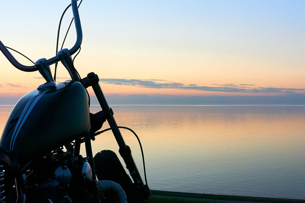 Silhouette of a classic retro moped on the dike at the Wadden Sea during sunset in black, blue and orange.