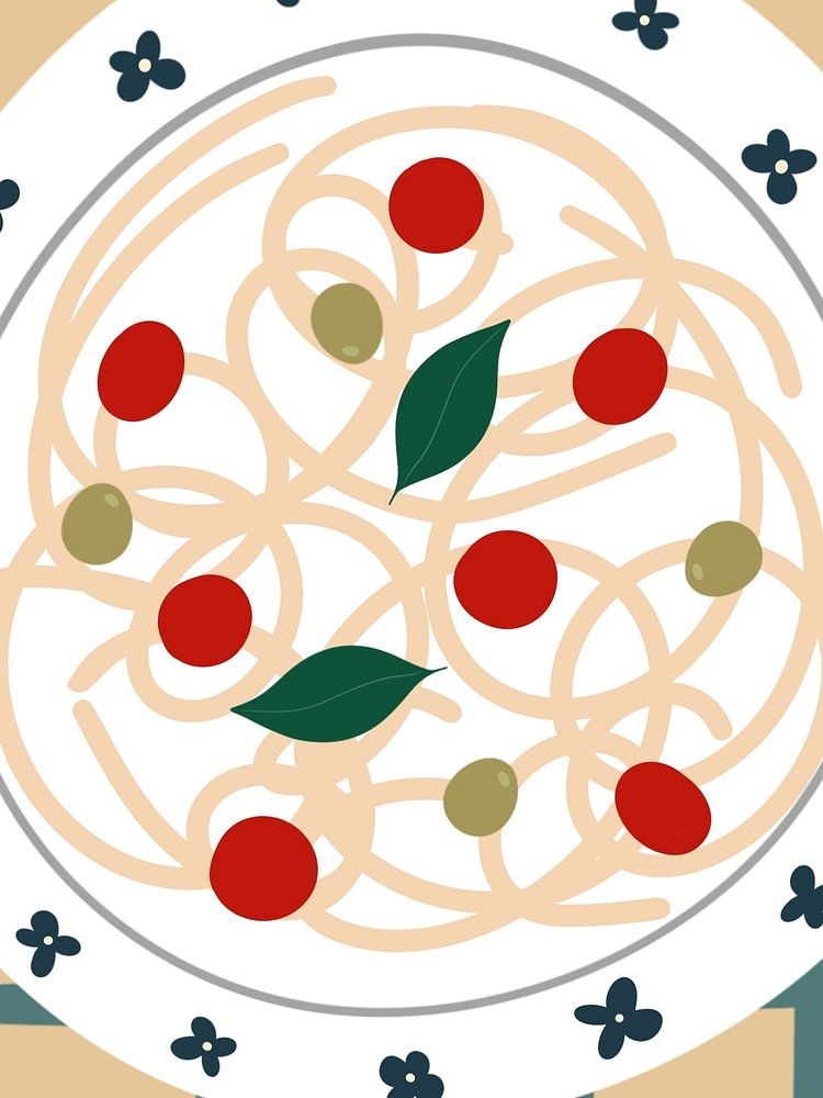 Foodies beware - a colourful ode to pasta lovers. This cheerful artwork featuring a plate of steaming spaghetti, bright red tomatoes and green olives is perfect for any pasta lover. The playful text "More pasta please" adds a breezy, cosy atmosphere to your kitchen, dining area or even your favourite restaurant! The soft colours and cute illustrations make this design a real eye-catcher. Ideal to show your love for good food and Italian vibes. This artwork literally invites you to grab an extra plate and enjoy it to the full. Add a glass of wine and enjoy!
