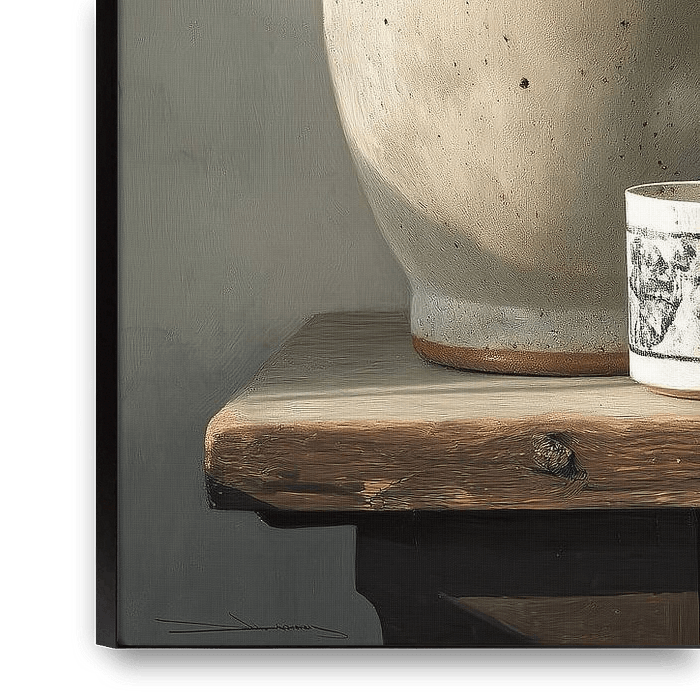 Morning Light Vases - This floral painting depicts a Japandi-style still life featuring a large cream-coloured earthenware pot on the left and an olive-green vase filled with delicate white flowers and twigs, set upon a rough wooden plank in warm, soft sunlight, with distinct ceramic textures and long shadows — a stylish floral…