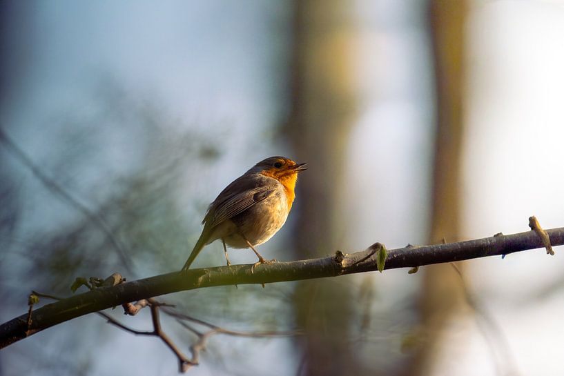 A robin basks in the warm morning light as it sings its song to the world. The soft background and subtle colours create a serene, almost dreamlike atmosphere. This photograph captures an intimate and soothing moment in nature—perfect as a stylish print that brings warmth, harmony and a touch of the outdoors into your home.
