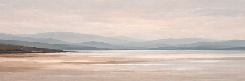 This painting captures the peaceful beauty of a tranquil morning landscape, in which rolling hills and a quiet lake merge beneath a soft, diffuse sky. The composition exudes a deep sense of calm and serenity that immediately captivates the viewer. The atmosphere is imbued with a subtle melancholy, which, however, does not seem…