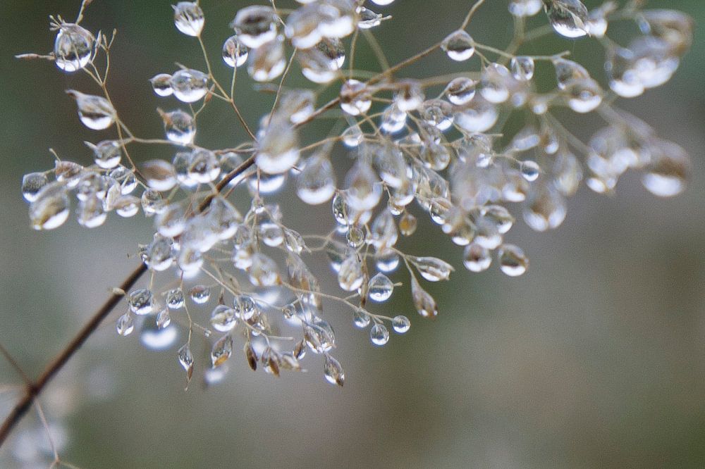 Morning dew on a blade of grass. Big drops that stick like pearls on a blade of grass. The happy feeling when you walk in the woods and a field full of spectators... that's why I got down on my knees for it. :-)