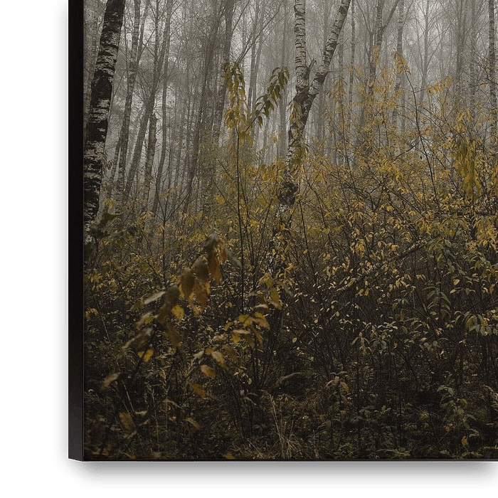 A misty morning in the forest can produce very pretty pictures. In the background the thin branches of the birch trees, with in the foreground a few bushes with already yellowed leaves. A soothing image without distractions. Perfect for a wall so you imagine yourself in nature.