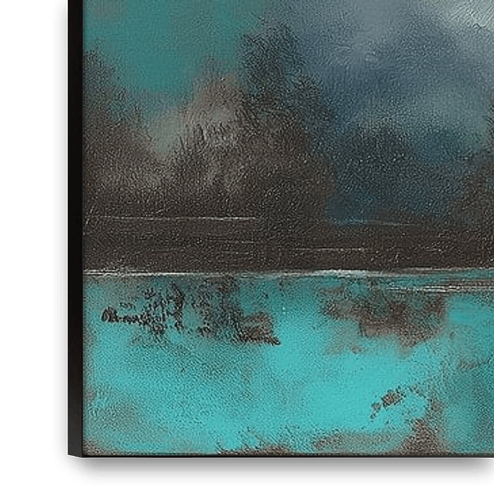 Morning Mist and Reflection - Looking at the surface, you can see how the artist played with layers and washes: broad, transparent areas for the sky, soft scratches and short, rough strokes for the row of trees and the water's edge. The tree shapes are dark and almost graphic, with a grainy texture that contrasts with the liquid sheen of the water. The colours speak in one tone: cool turquoise and aqua dominate, interspersed with sandy and creamy washes and muted greys that suggest the mist. This abstract painting works as a translation of a morning by the water — not literally, but as a memory of light falling through mist, at the border between sky and reflection. Hanging this painting in a living room, hall or bedroom brings tranquillity, a quiet movement and an elegant, natural colour accent that combines well with wood, linen and stone finishes.