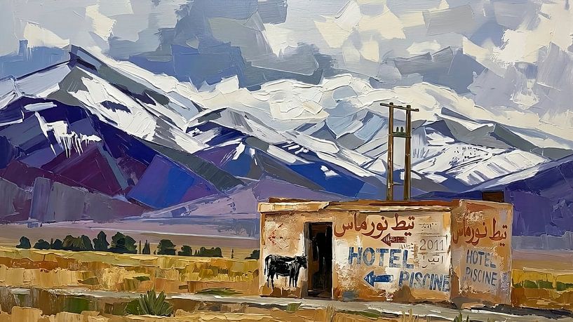 This expressive oil painting captures the fascinating contrast between human transience and the eternal grandeur of nature. In the foreground stands a solitary, abandoned hut on the edge of a country road in Morocco, its walls adorned with charming, hand-painted signposts pointing to a distant ‘Hotel’ and ‘Piscine’ (swimming…