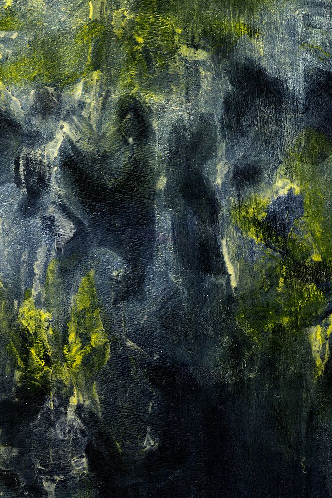 In this work, we see abstractly painted bright yellow chrysanthemums emerging from a white haze on a black background. The contrast between the dark and light enhances the fragility of these flowers and creates a serene atmosphere.