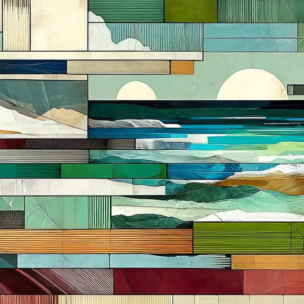 An artistic composition depicting a stylised landscape with horizontal strips representing different elements of a scene. The lower layers seem to illustrate the front part of a landscape with varied shades of green that might represent fields or forests. Above are strips of blue and turquoise that could represent a series of waves or a lake, creating a sense of depth and spaciousness.